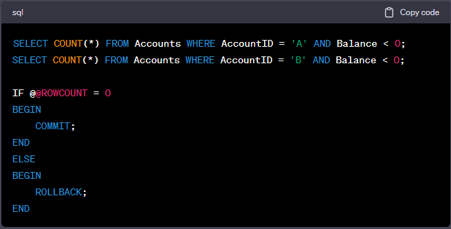 Ở bước này, chúng ta kiểm tra xem tài khoản A và tài khoản B có đủ số tiền để thực hiện giao dịch không. Nếu số tiền trong tài khoản A không đủ hoặc số tiền trong tài khoản B bị âm, transaction sẽ bị rollback và các lệnh SQL sẽ không được lưu vào cơ sở dữ liệu. Nếu tất cả các điều kiện đều đúng, transaction sẽ được commit và các lệnh SQL sẽ được lưu vào cơ sở dữ liệu.